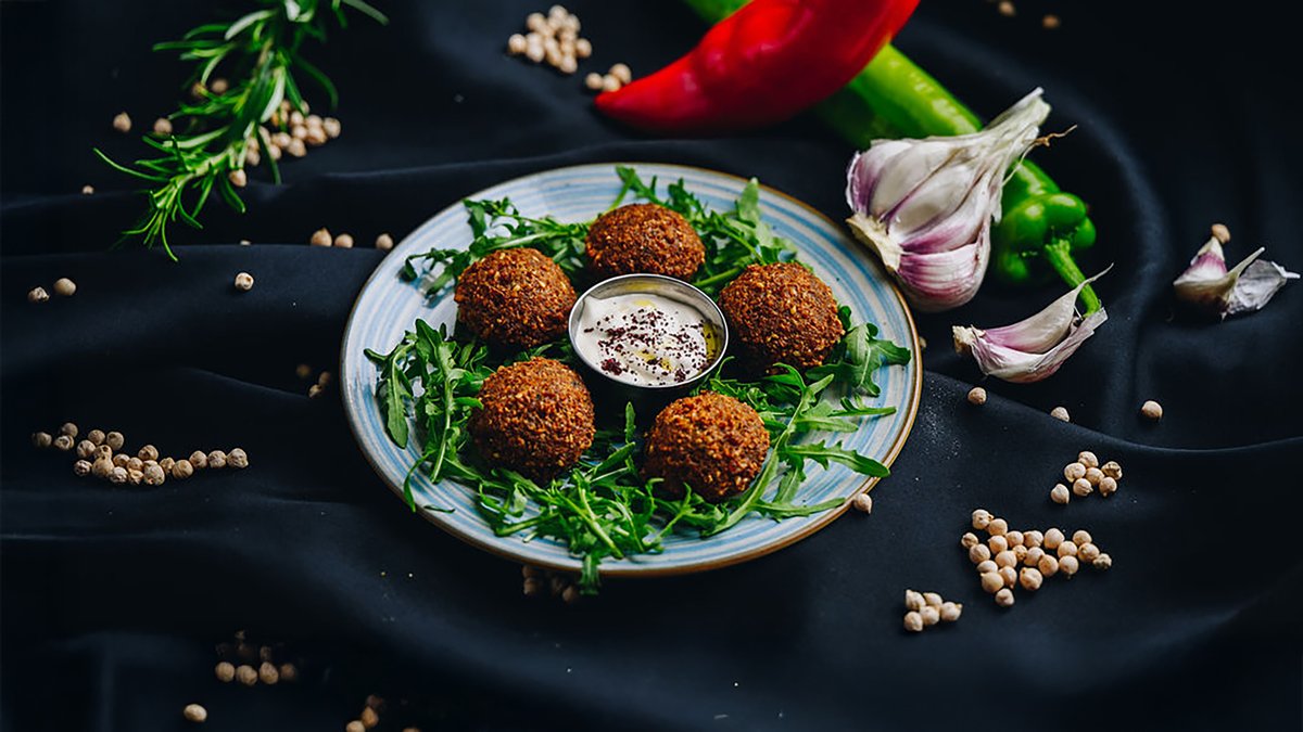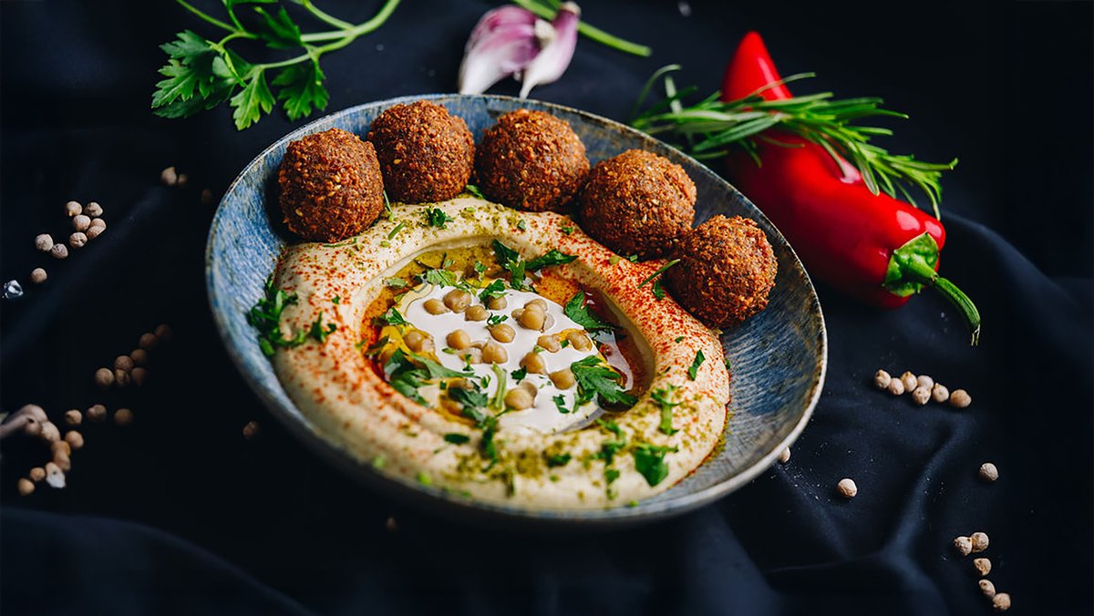 5 kuliček falafelu, hummus, tahini, amba, saláty 5 falafel balls, hummus, tahini, amba, salads