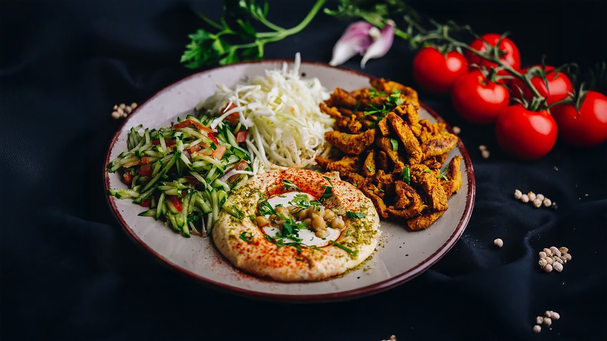 kuřecí řízek, hummus, tahini, amba, saláty chicken schnitzel, hummus, tahini, amba, salads