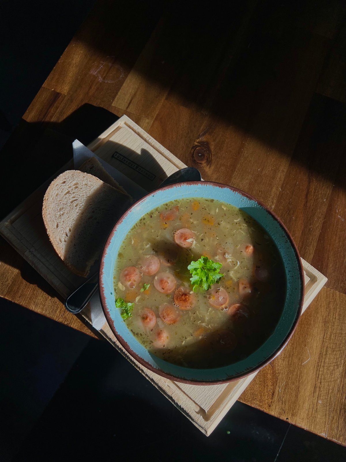 450 ml čočková polévka s párečky, kořenovou zeleninou a vejcem