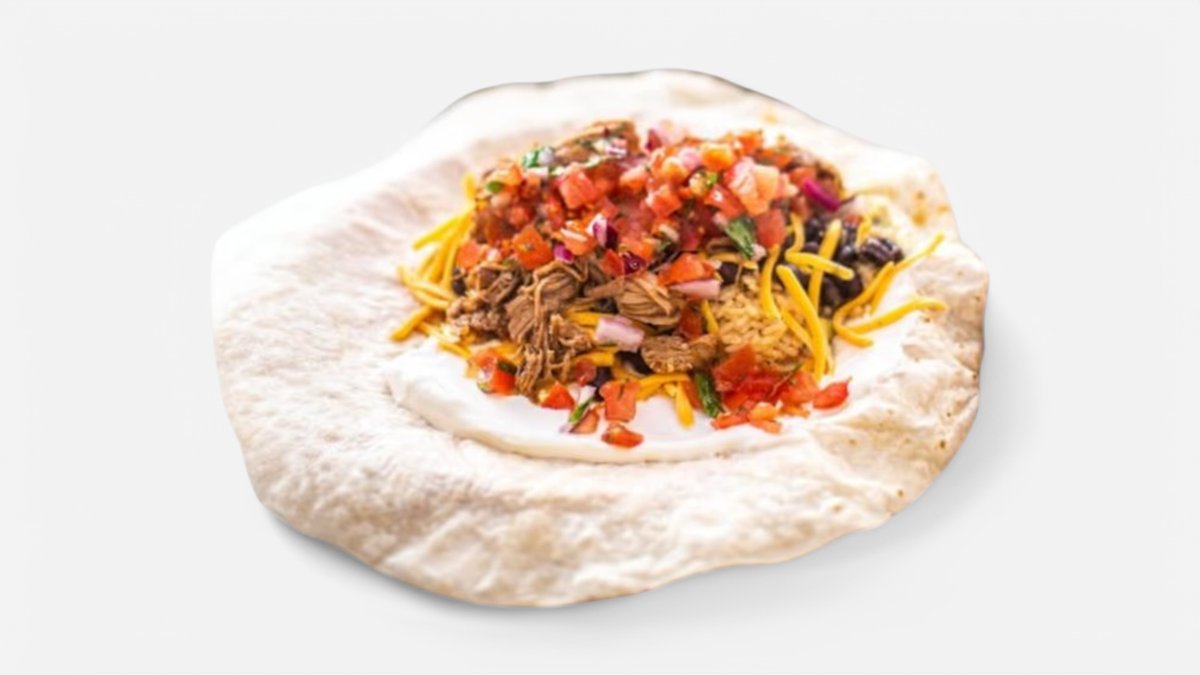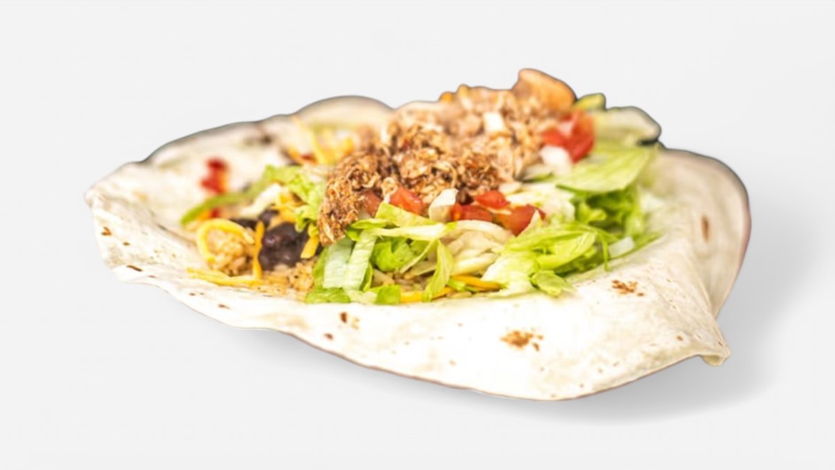 Velká pšeničná tortilla, rýže a fazole dochucené vlastními směsi koření, šťavnaté maso, čedar, naše salsa, zakysaná smetana a čerstvé guacamole./ Flour tortilla filled with rice, black beans, cheddar, sour cream, guacamole, meat and salsa