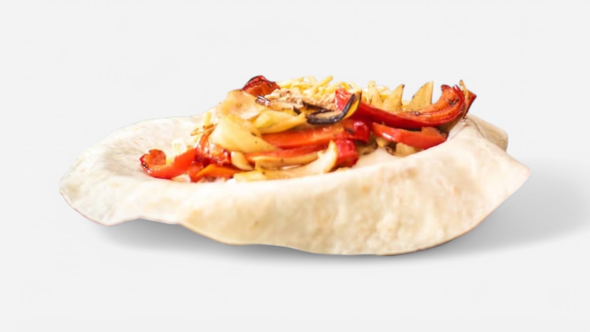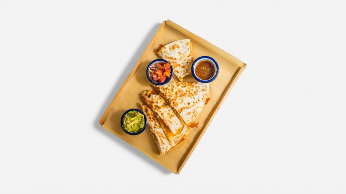 Velká zapečená pšeničná tortilla, 130g čedaru, maso, zeleninu a salsu vyberte v možnostech. / Grilled flour tortilla filled with cheddar, choice of vegetable, meat and salsa.