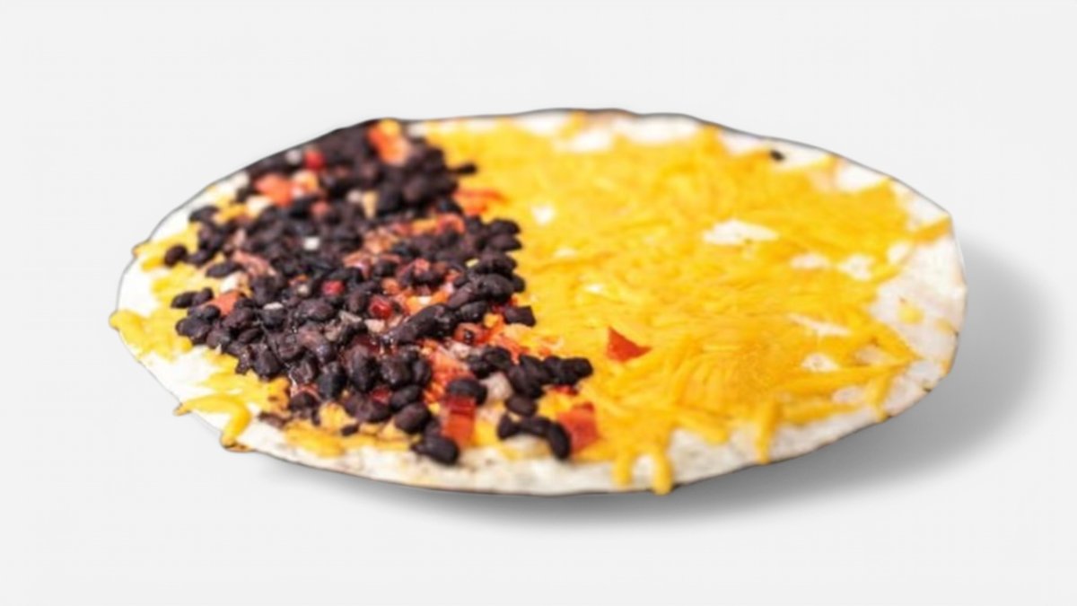 Velká pšeničná tortilla, 130g čedaru, černá fazole, zelenina a naše salsa dle výběru. / Grilled flour tortilla filled with cheddar, black beans, vegetable of choice, salsa.