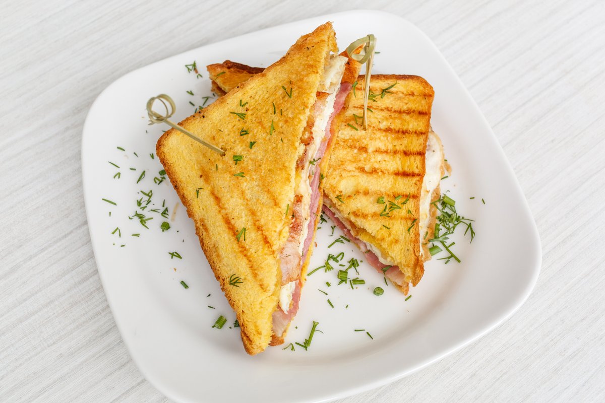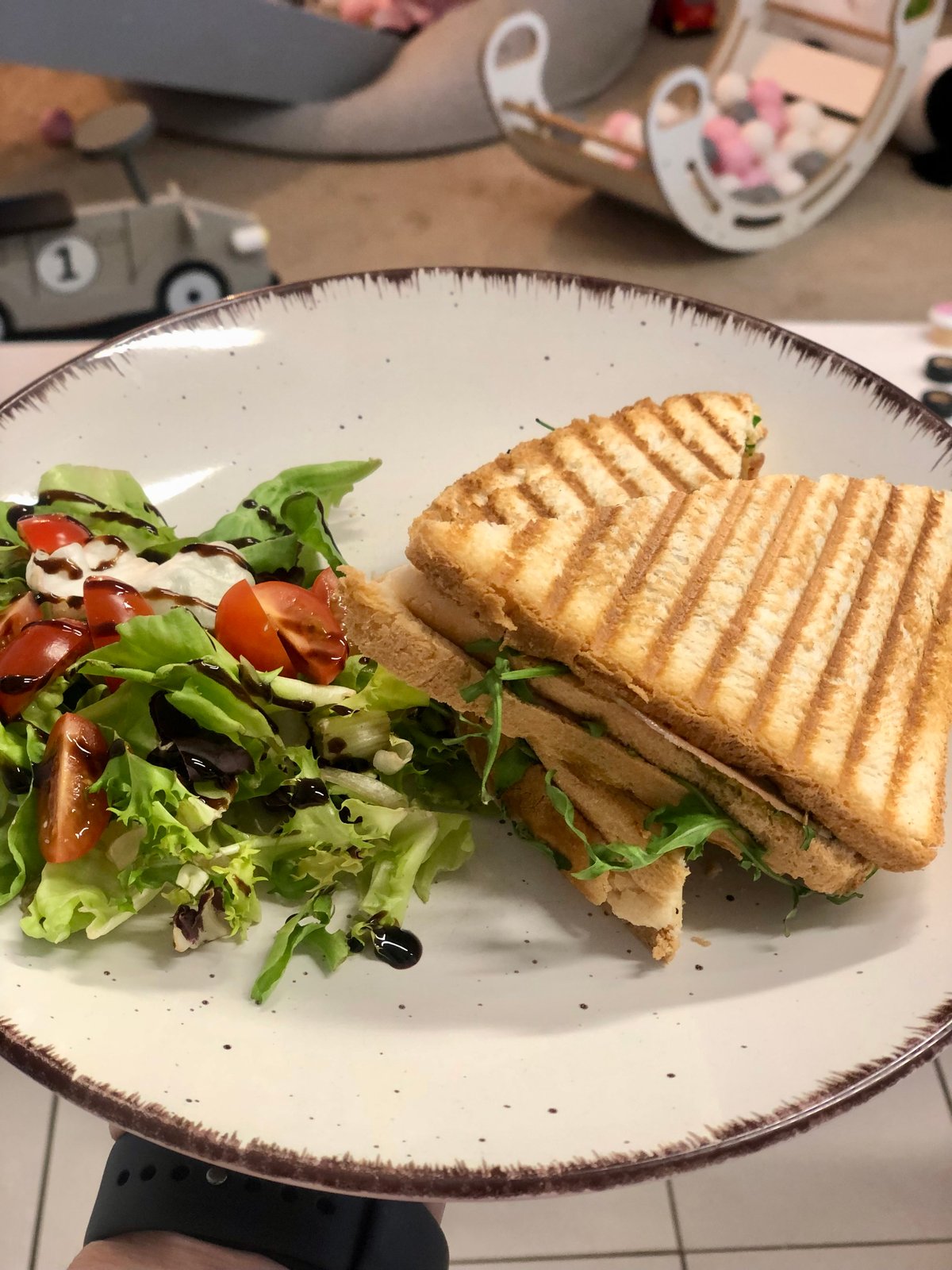toastový chléb, žervé, pesto, rukola, prosciutto, sušená rajčata, čedar, servírováno se salátkem