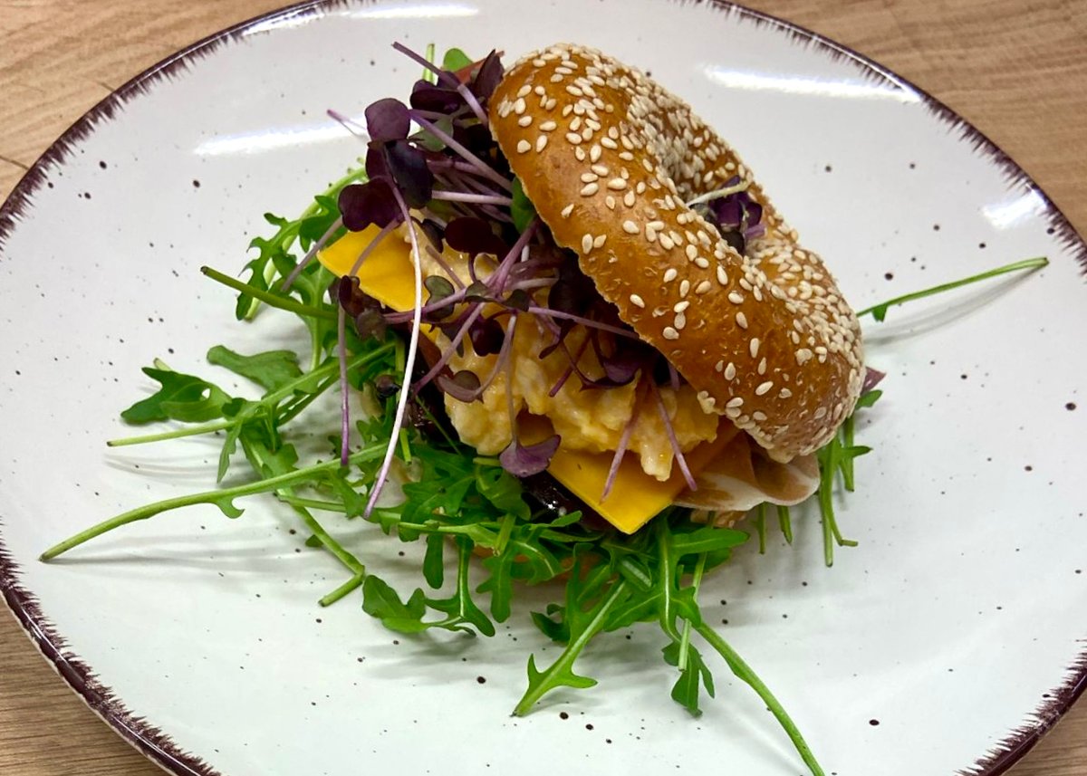 bagel, žervé, medova hořčice, rukola, cibulové chutney, opečená slanina, čedar, míchané vajíčko