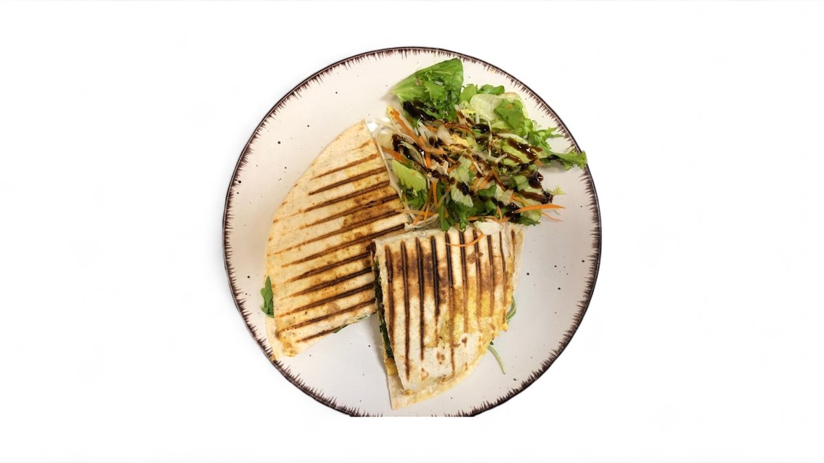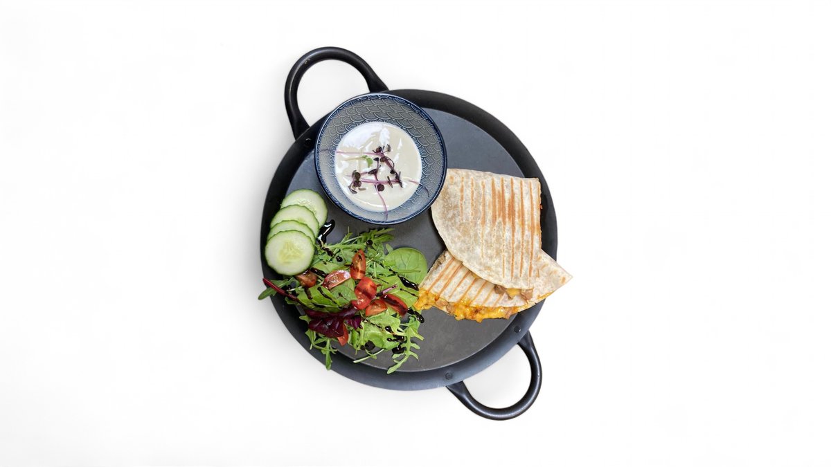 tortila plněná trhaným vepřovým masem, BBQ omáčkou, rajčaty a sýrem. servírované se salátkem