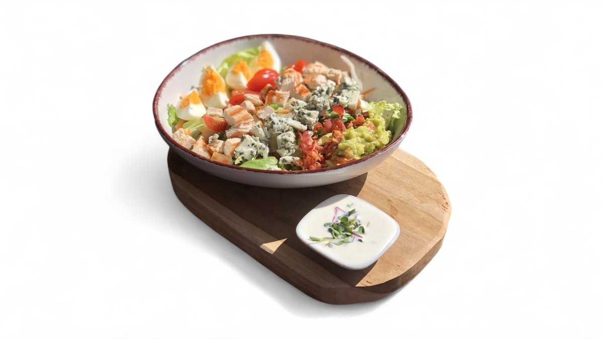 salát, vejce, slanina, rajčata, guacamole, sýr, náš dresink