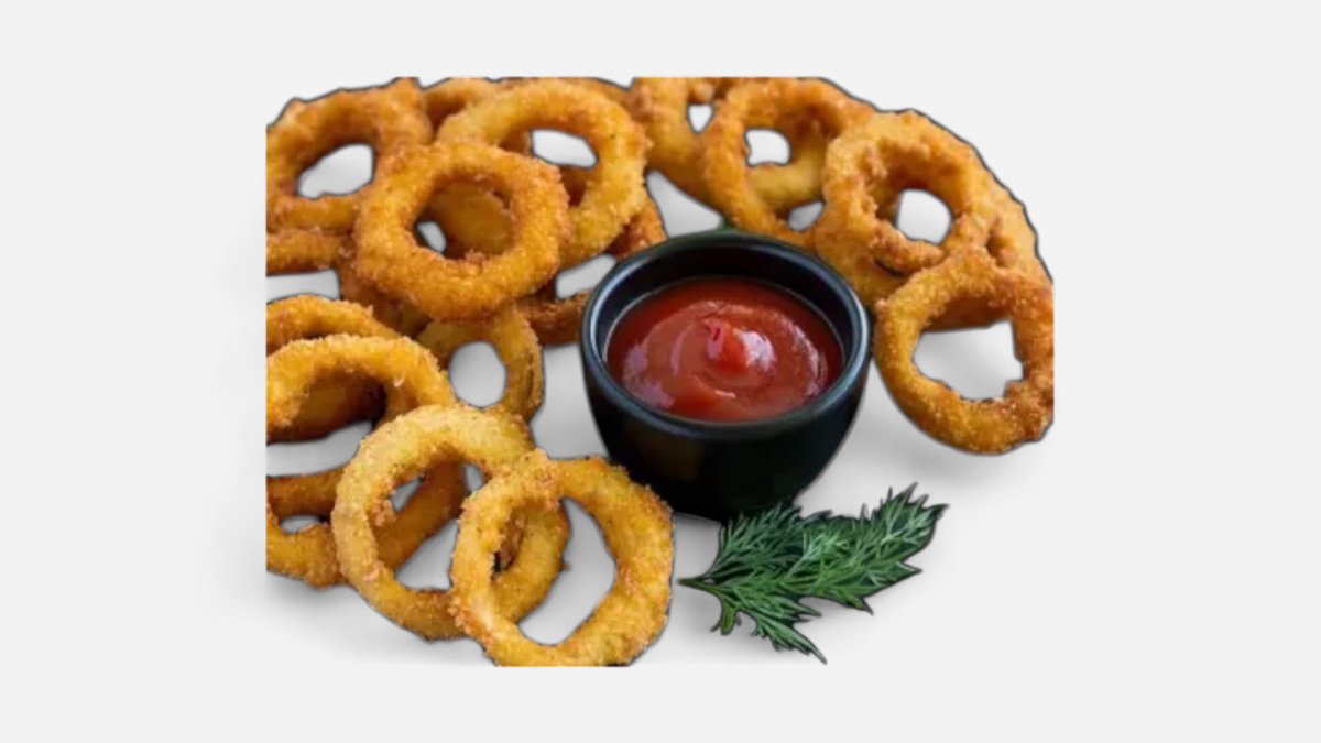 Zlatavé, křupavé cibulové kroužky, dokonale smažené, ideální jako svačina.