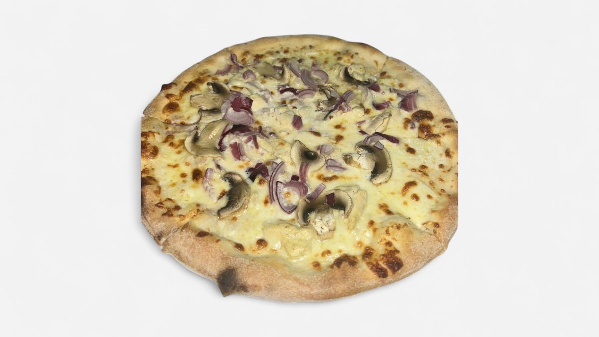 Smetana, mozzarella, kuřecí maso, žampiony a cibule červená.