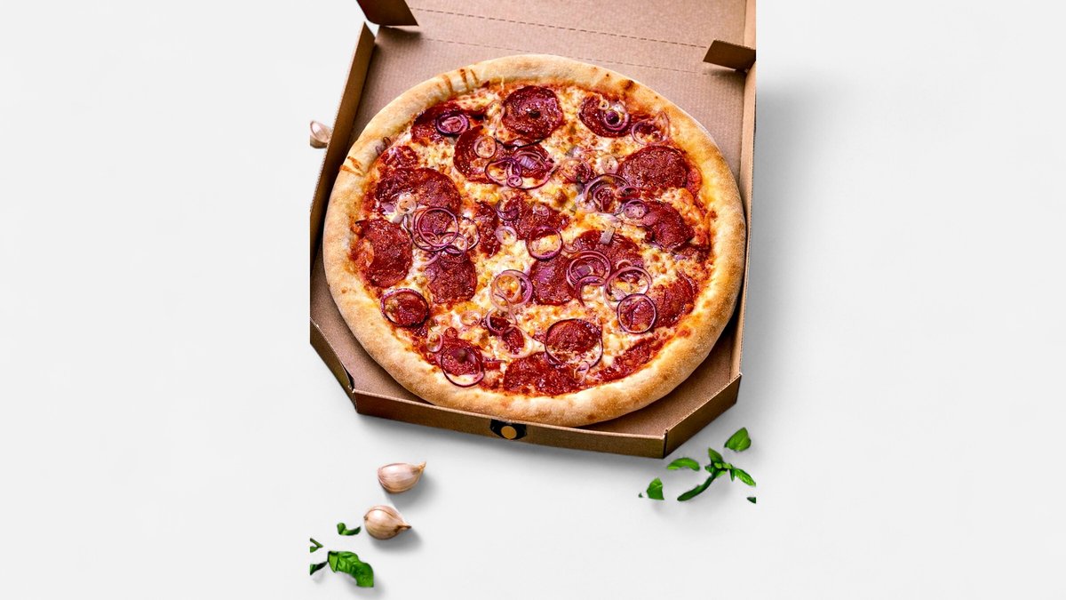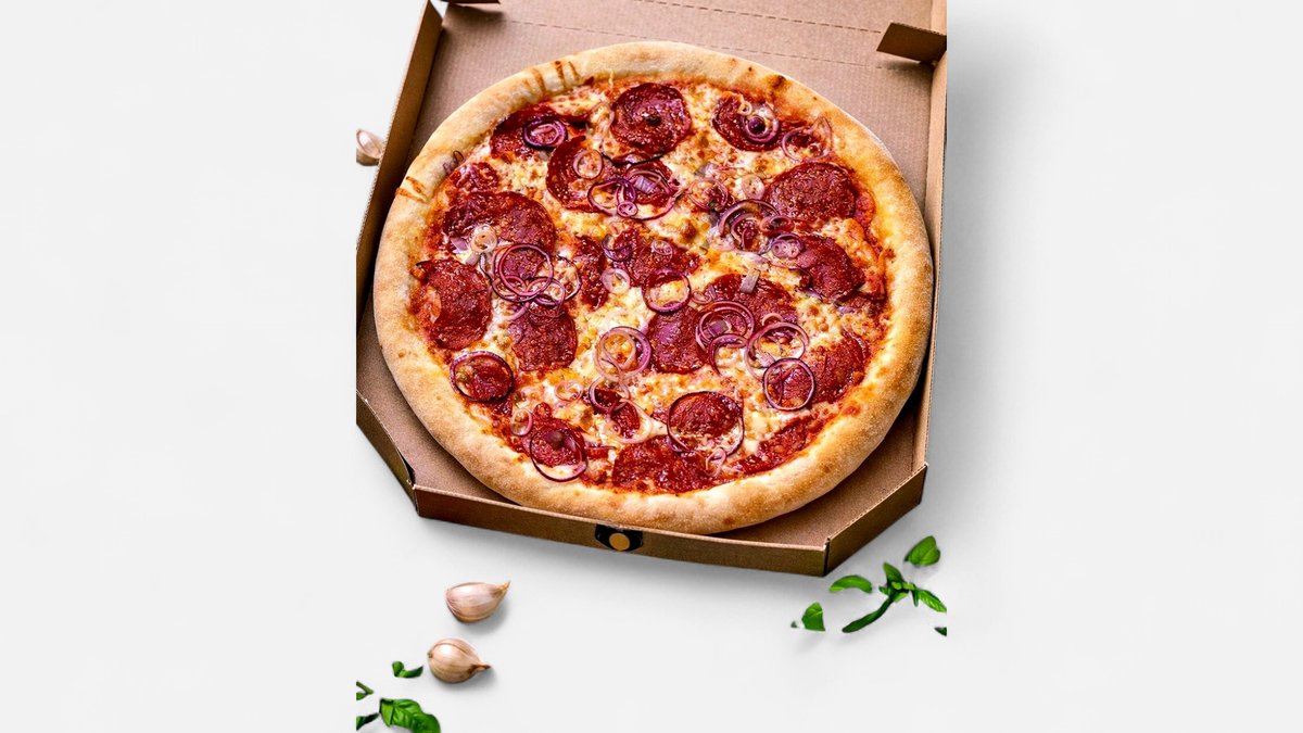 rajčata, mozzarella, pikantní salám, niva, cibule