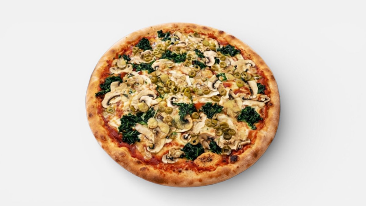 rajčata, mozzarella, žampiony, špenát, olivy, česnek