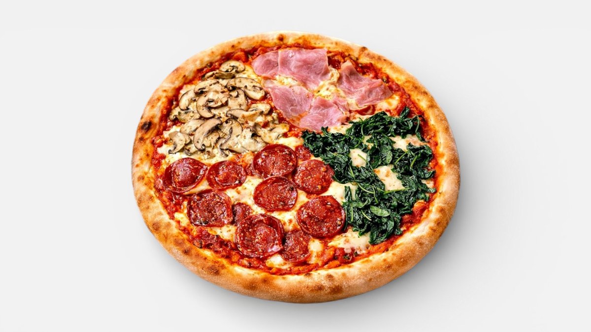 rajčata, mozzarella, šunka, pikantní salám, špenát, žampiony