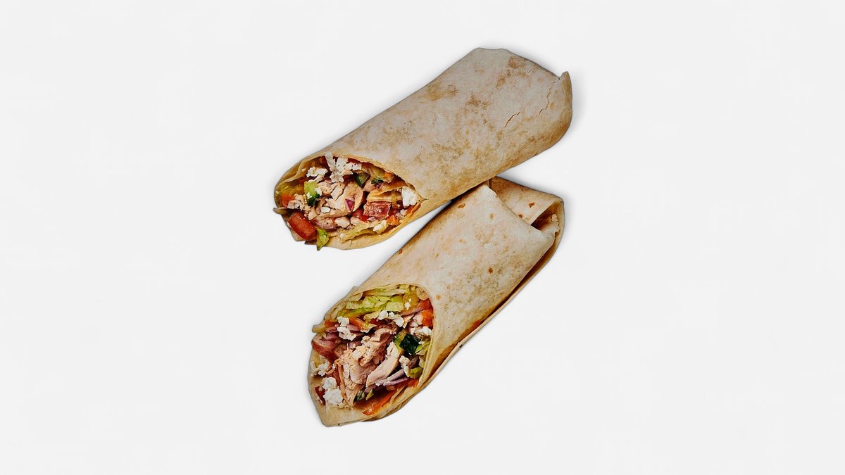 Složení: Kuřecí maso stehenní 100 g (hrubá váha 150 g), pšeničná tortilla, rajčata, okurky, ledový salát, mrkev, červená cibule, balkánský sýr, dresink dle výběru