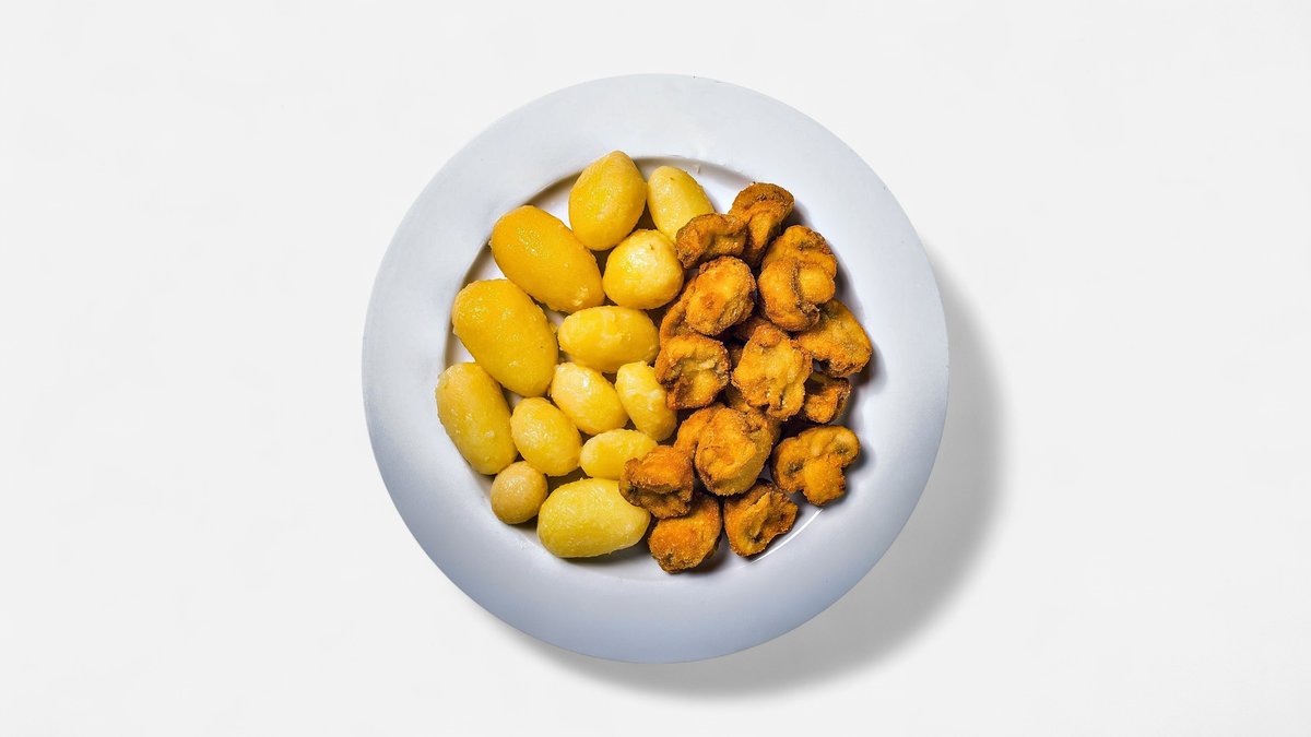 Složení: žampiony 200 g obalené v strouhance, vařené brambory s máslem