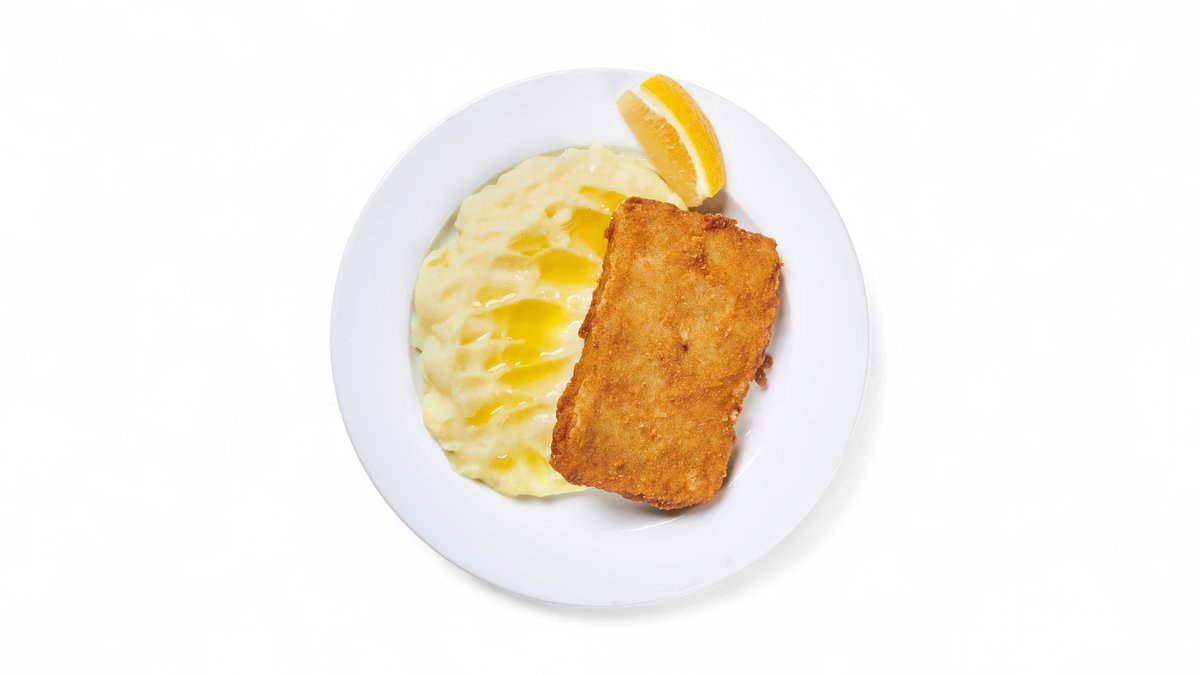 Složení: smažené rybí filé (hrubá váha 150 g) obalené v trojobalu, bramborová kaše