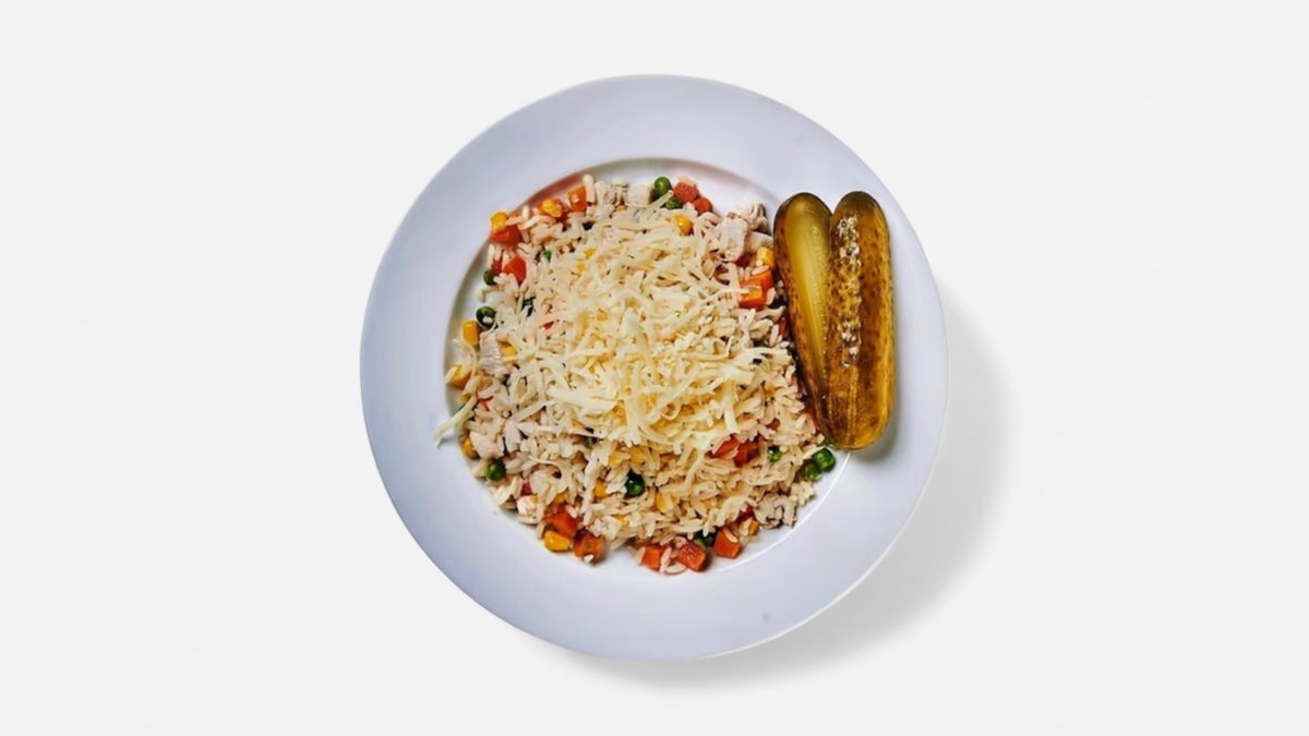 Složení: dušená rýže, vepřová plec (hrubá váha 100 g), vepřový bok (hrubá váha 400 g), lečo směs, cibule, hrášek, sýr eidam, okurka (váha porce 430 g)