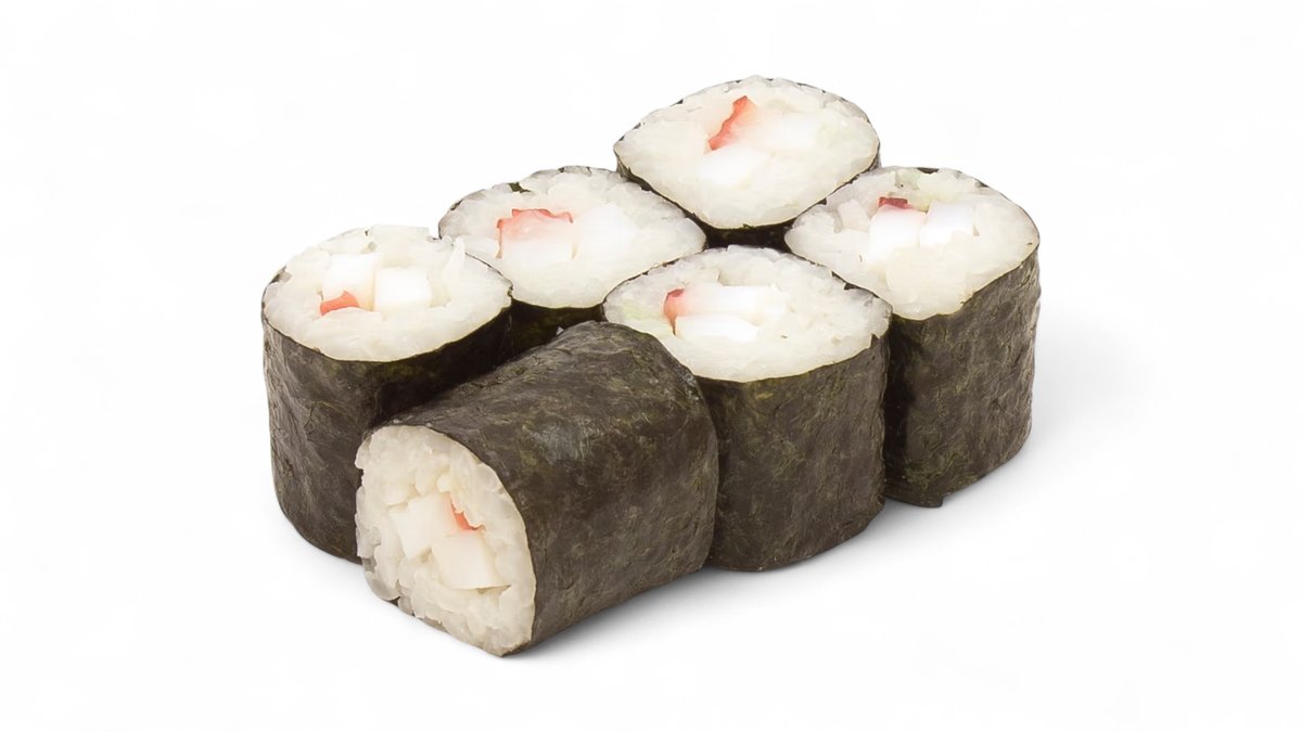 smažené krevety v tempuře, avokádo, okurka, nakládaná ředkev. Navrchu: tempura sypání, teriyaki omáčka
