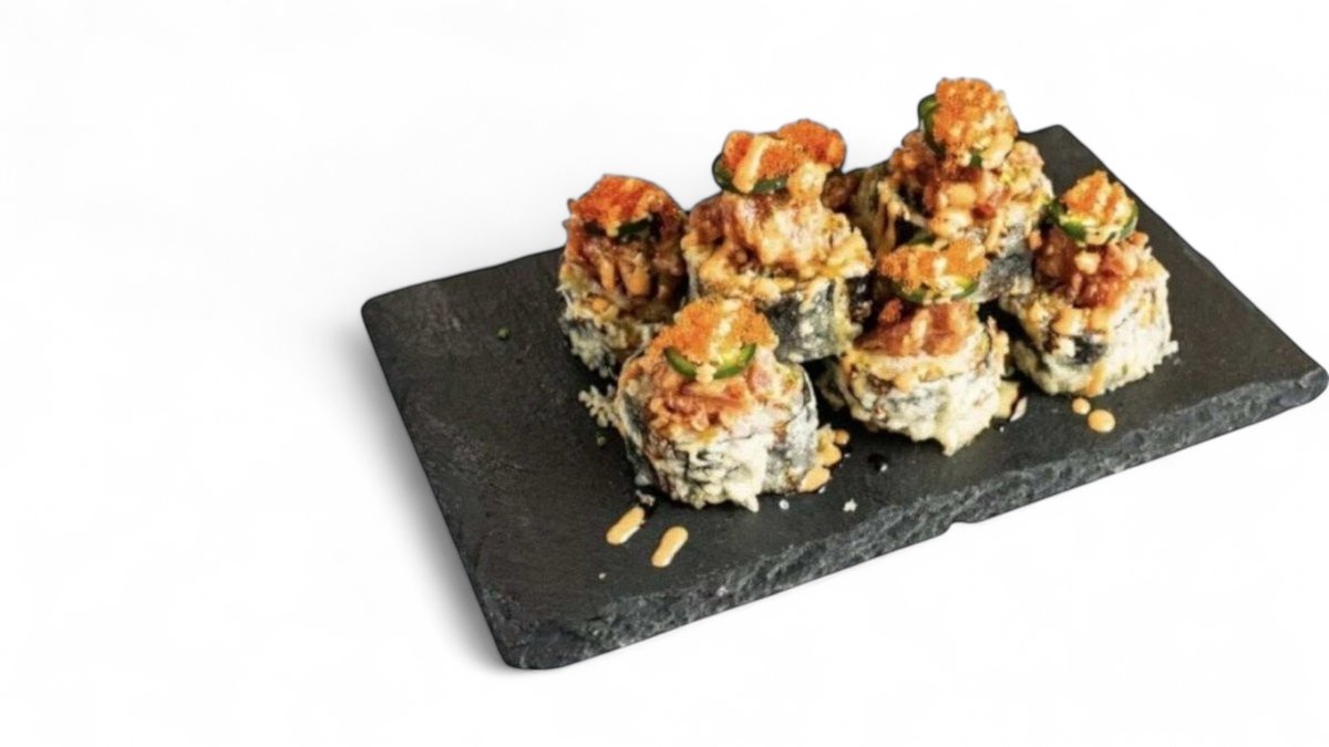 smažené krevety v tempuře, avokádo, okurka, krabí krém. Navrchu: pálivý tuňák, křupavá cibule, kaviár z létající ryby, pálivá a teriyaki omáčka