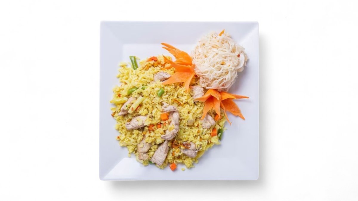 Restovaná rýže, vajíčka a nakládaná zelenina