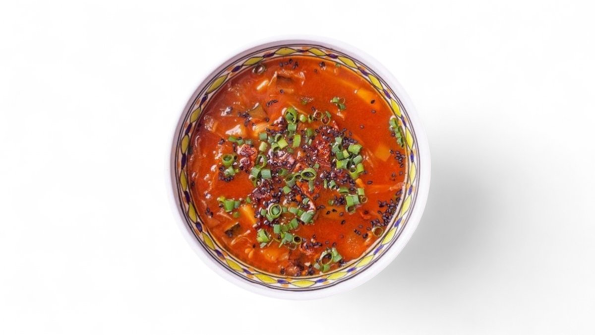 Silný vývar s wonton knedličky, bok choy a jarní cibulka