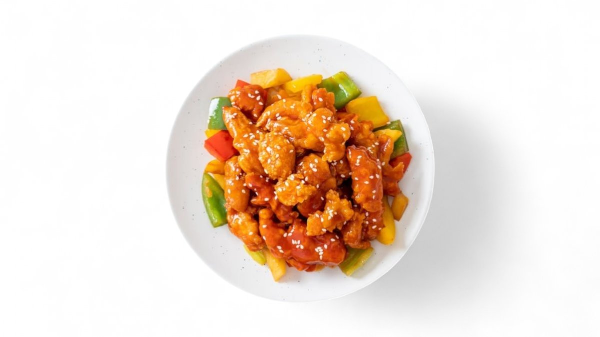 Kuřecí maso, cibule, koření, sečuánská omáčka a sezam