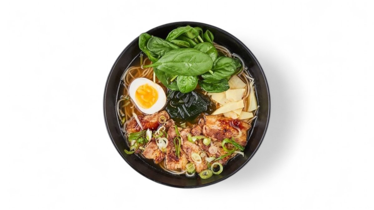 Ramen polévka s krevetami, rybí koláčky naruto, vajička, vepřová krkovice a zelenina