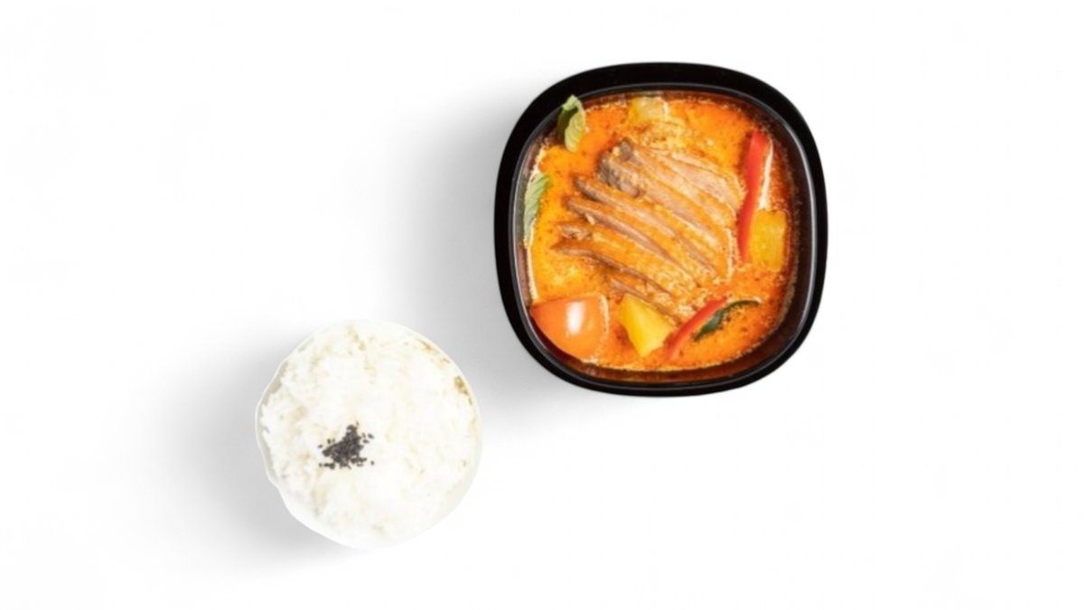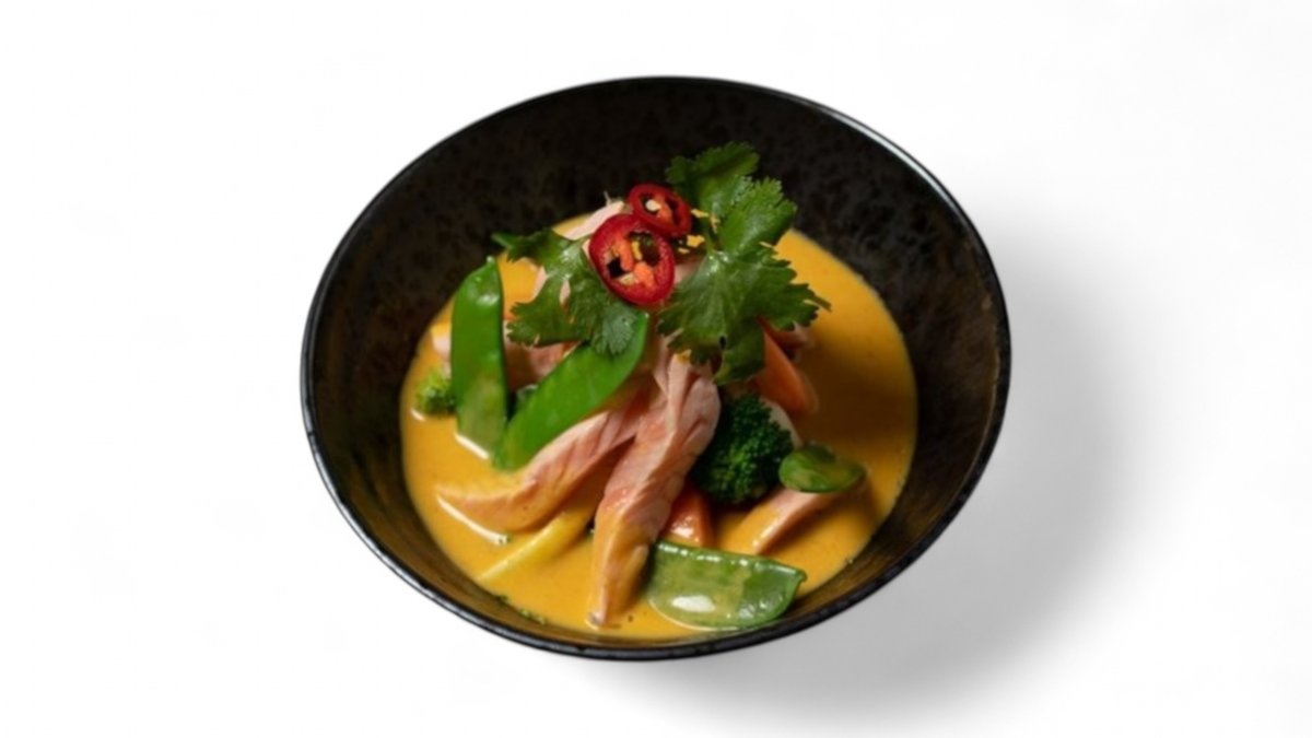 Červené kari s kachním prsíčkem, sezónní zelenina (200g) (Doporučujeme s batátovými hranolkami)