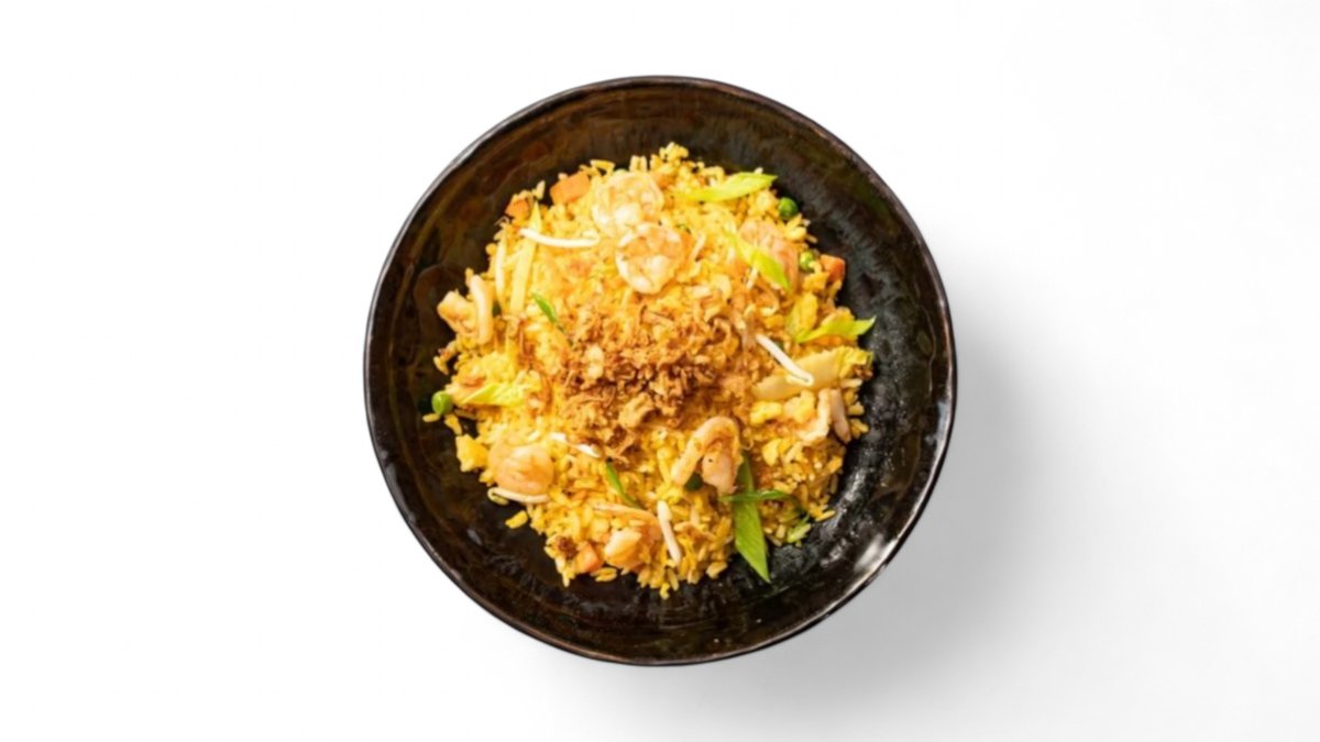 Žluté kari s lososem, rýžové koule v tempuře a pak choi