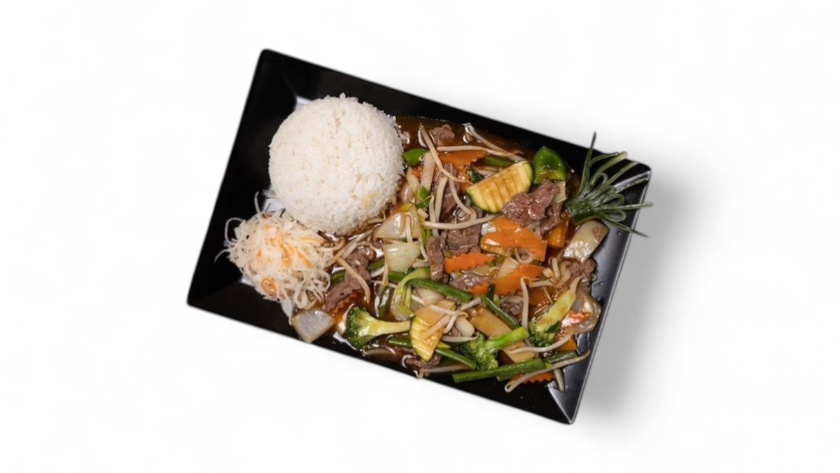 Restované maso na chilli pastë s bazalkou, zeleninou, cibulkou, kokosové mléko a jarní cibulka (Doporučujeme s rýži)