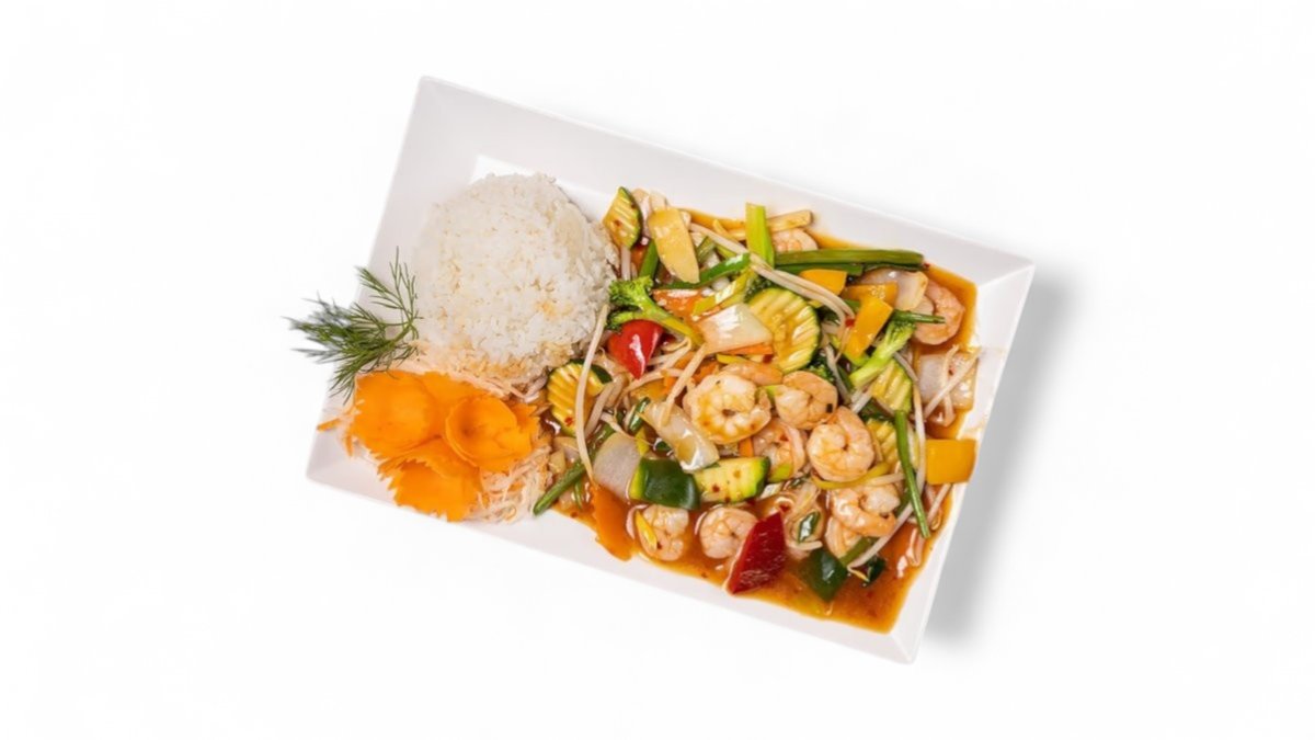 Vepřové maso, krevety, cibulka, koření, sezam a sečuánská omáčka
