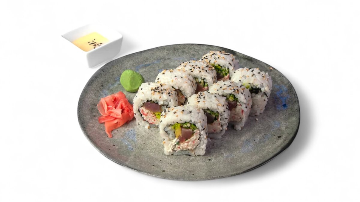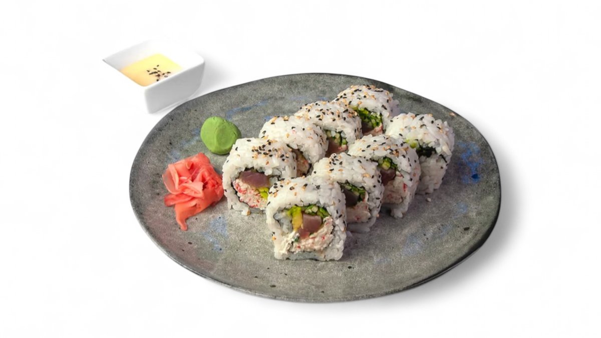 Uvnitř: tuňák, okurka, sýr, avokádo a krabí krém. Vně: pikantní tuňák, kořen lotosu, wasabi omáčka a teriyaki