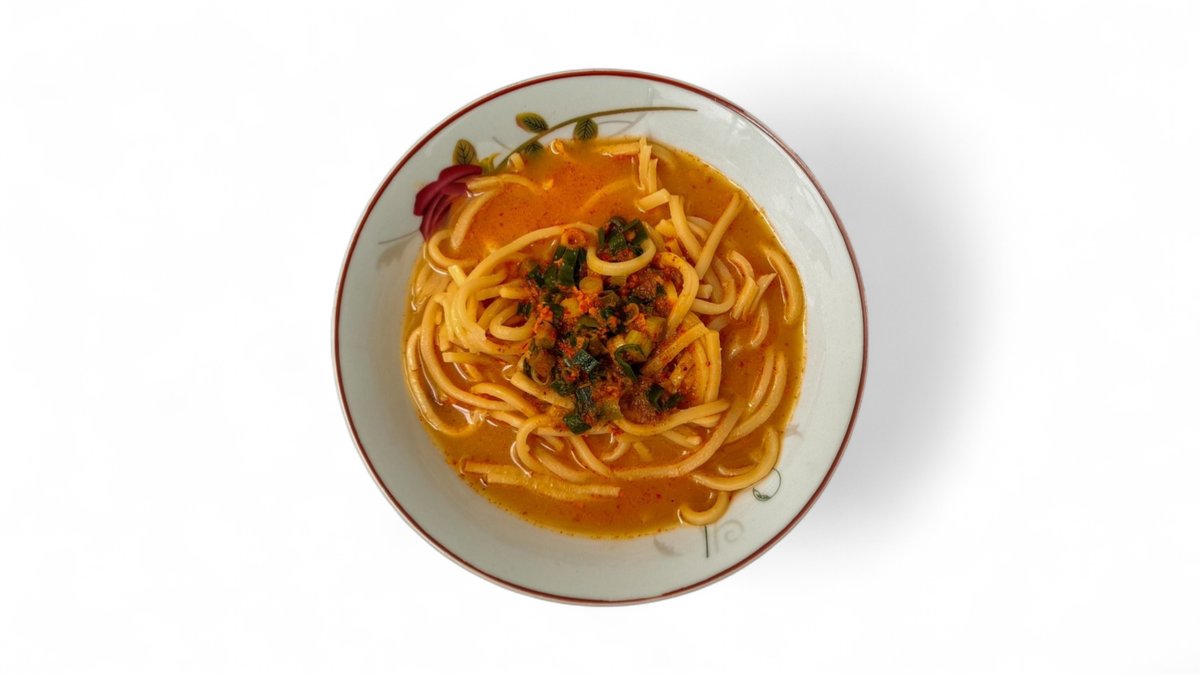Restované ramen nudle s červenym kari, žampiony, špenátem а mořskými plody