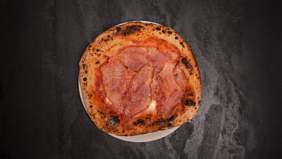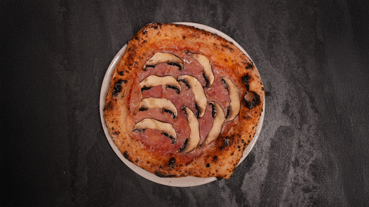 sugo, dušená šunka, sýr mozzarella, žampiony portobello, olivový olej