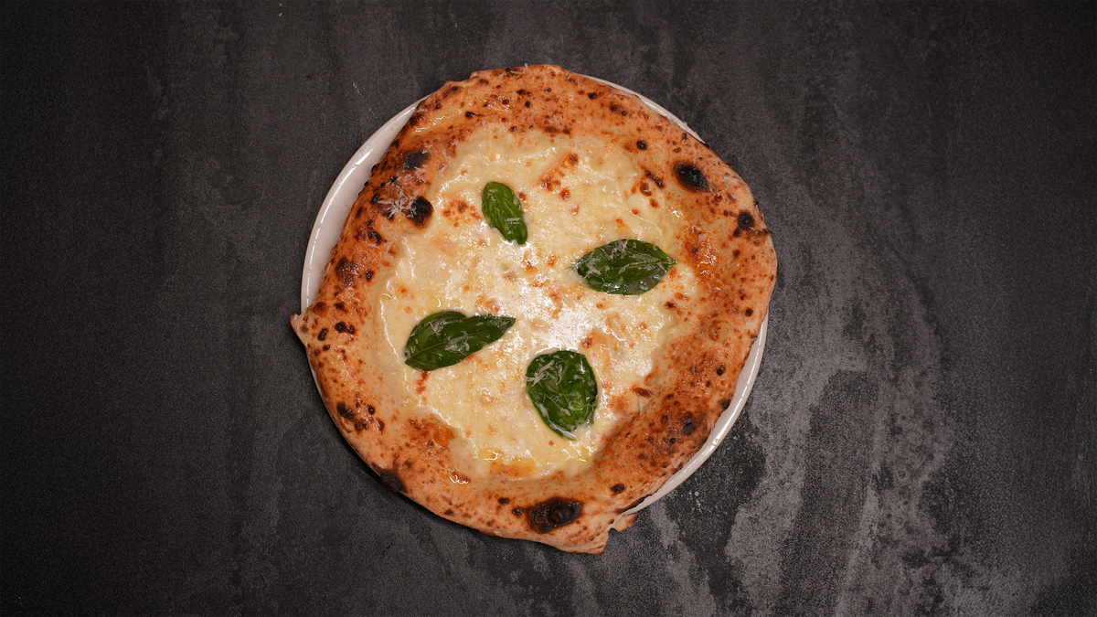 sýr grana padano, sýr gorgonzola, sýr scamorza, sýr mozzarella, čerstvá bazalka, olivový olej