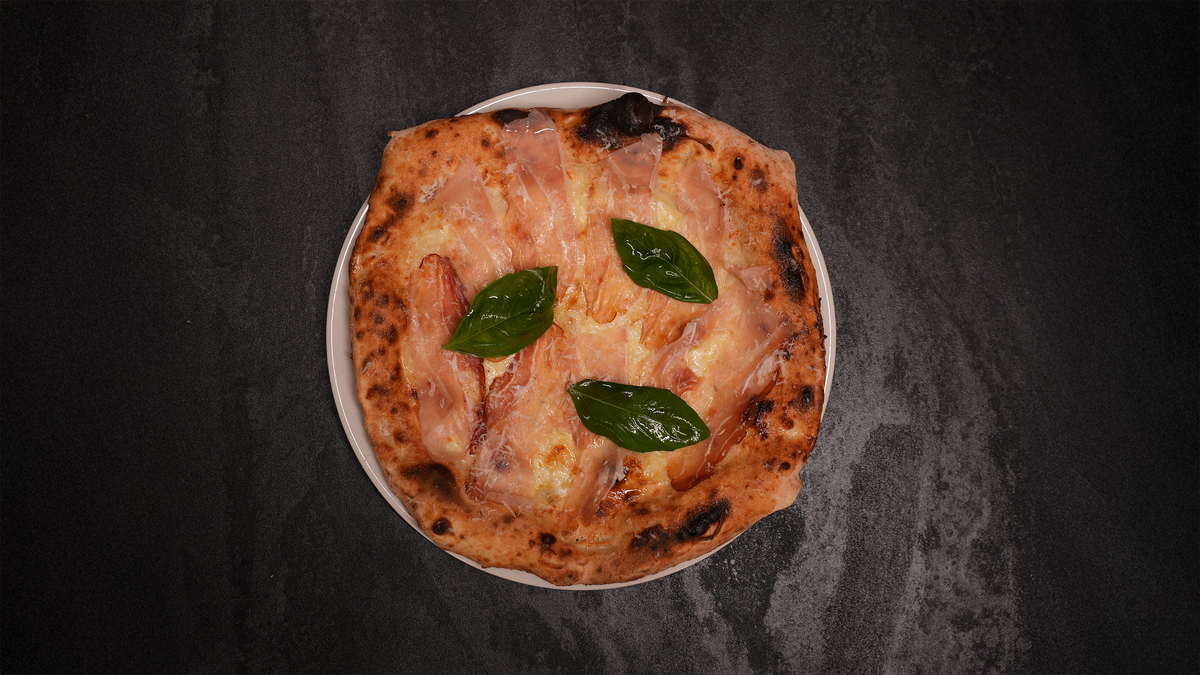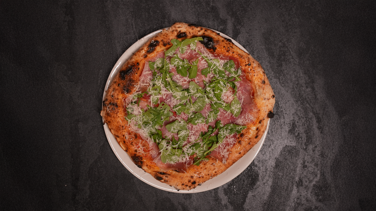 sugo, sýr mozzarella, crudo, rukola, sýr grana padano, olivový olej