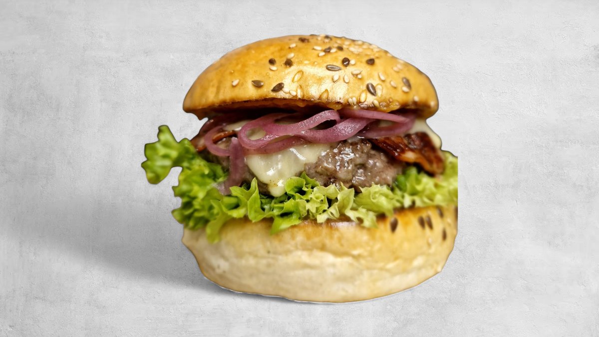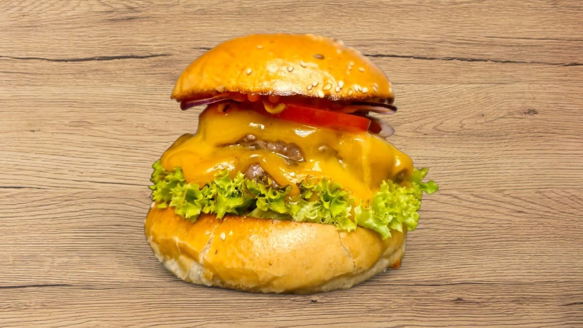 2x 120g hov. maso, 2x cheddar, nakládaná okurka, salát, mayonéza, rajče, červ. cibule
