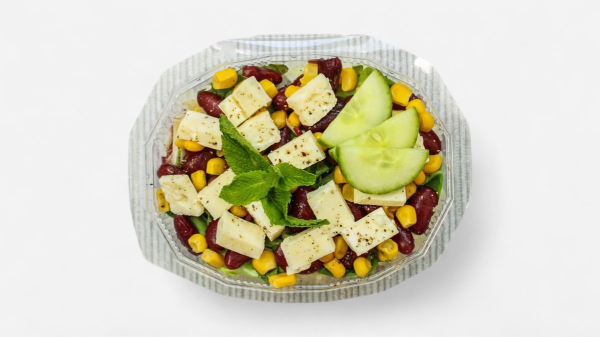 Kuskus se salátovým mixem, balkánským sýrem, fazolkami a kukuřicí