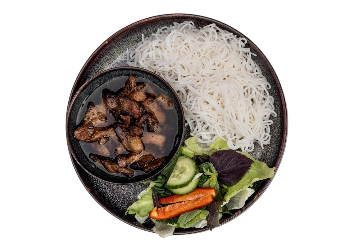 bún nudle s grilovaným vepřovým masem na citrónové trávě, čerstvé bylinky