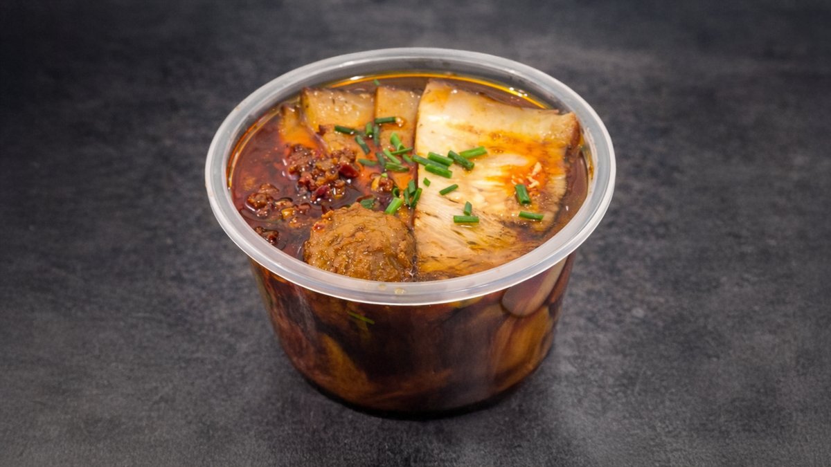 Veganská varianta oblíbené bolognese připravená z mletého sójového masa. Omáčka je vařená na rajčatovém základu s chilli a česnekem a doplněná o červené fazole, kukuřici a hrášek. Podává se s pšeničnými nudlemi, ledovým salátem ochuceným čínským octem, česnekem a soy omáčkou a 3 ks vegan mandu. Plná chuť bez masa.