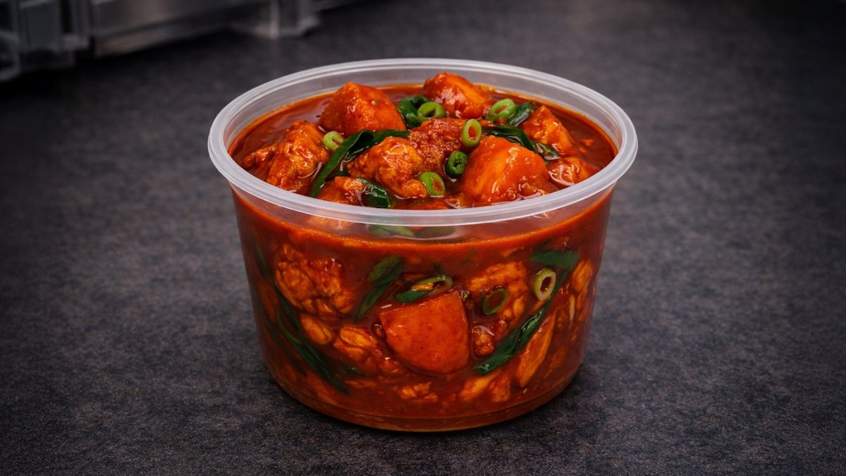 Dušené hovězí maso (100 g) ve speciální omáčce, měkké a aromatické. Bramborová kaše, 200 g rýže, 3 kimbaby a čerstvý salát. ✨ Prémiová kvalita pro milovníky hovězího.