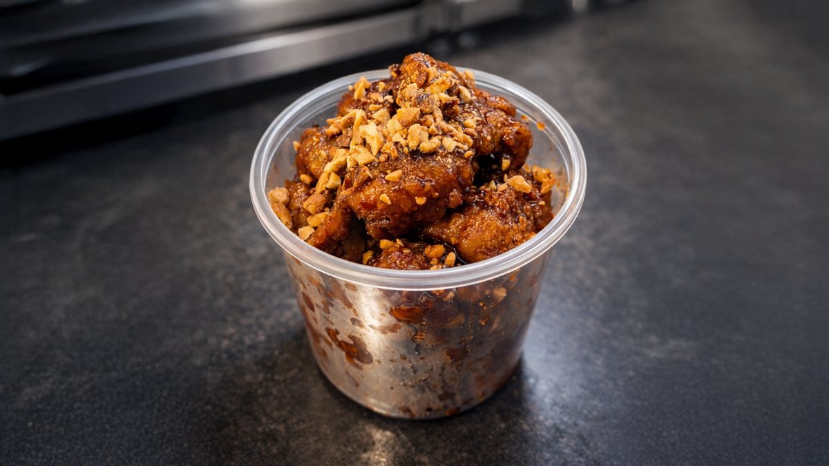 Křupavé smažené kuřecí kousky, obalené v jemně sladké tmavé omáčce a posypané praženými arašídy, které dodají výraznou vůni a příjemnou křupavost. Alergeny: 1 (lepek), 3 (vejce), 5 (arašídy), 6 (sója)