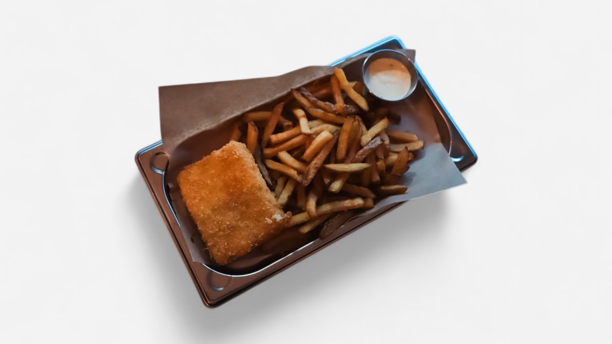 norská treska (135 g) v pivním těstíčku, naše hranolky, mačkaný hrášek a tatarka