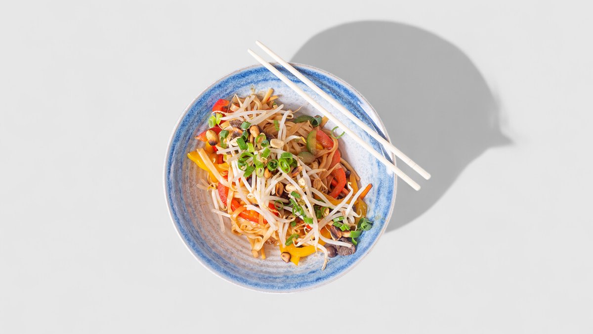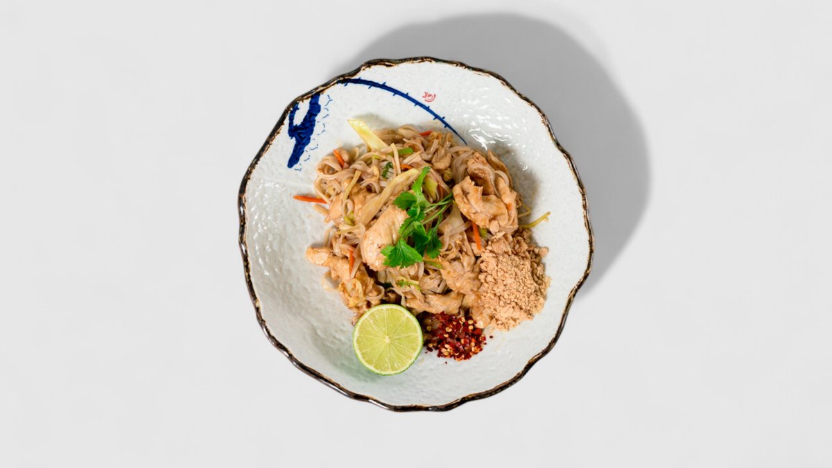 Kuřecí Pad Thai: thajské rýžové nudle smažené s vejcem, dochucené pikantní sladko-kyselou omáčkou