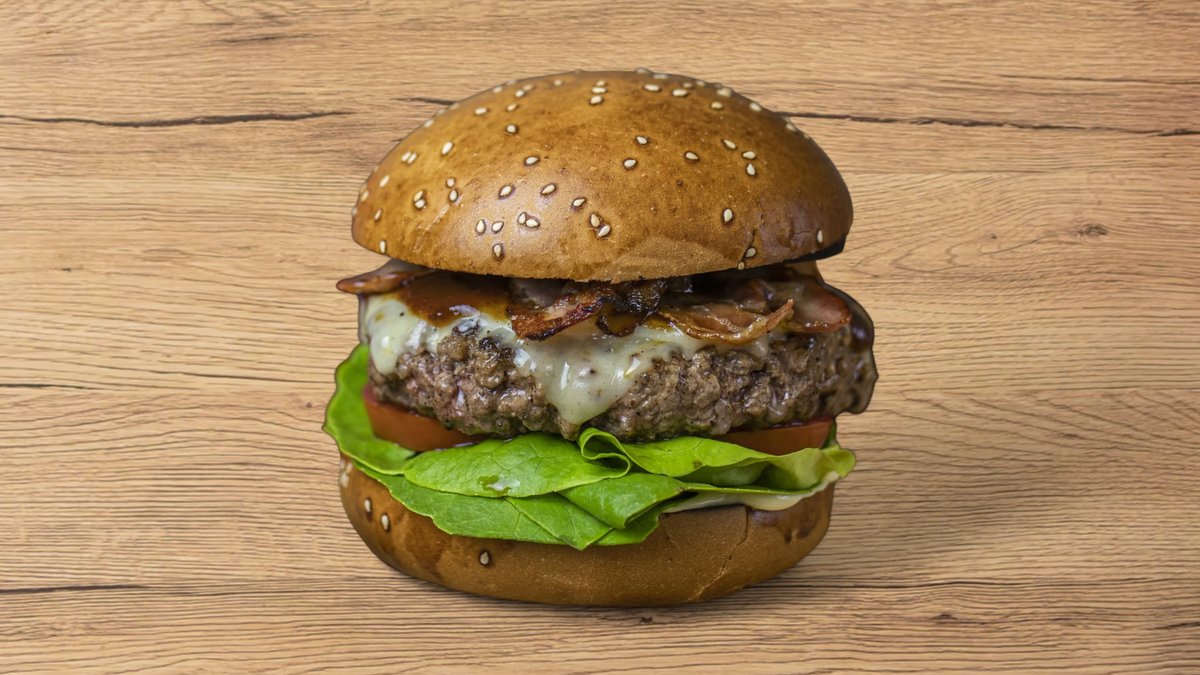 Hovězí maso, zauzená majonéza, salát, rajče, cheddar, slanina, červená cibule.
