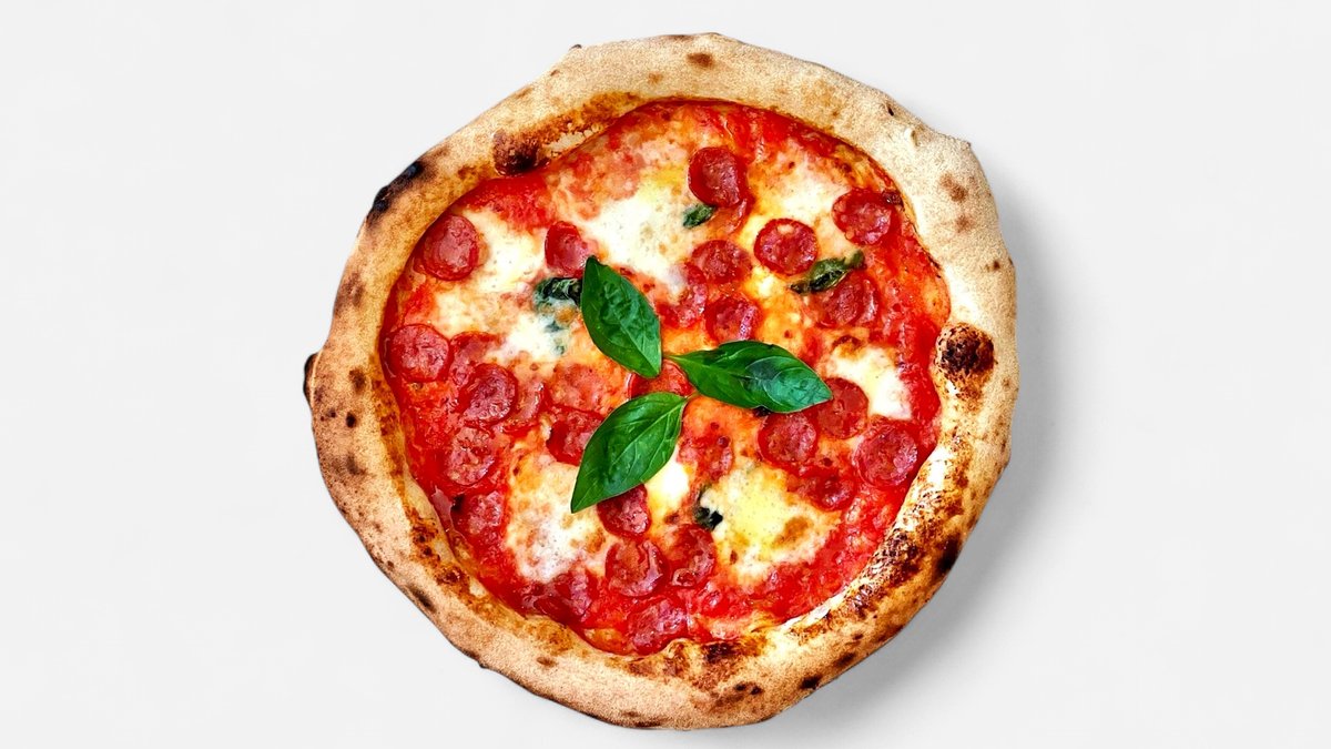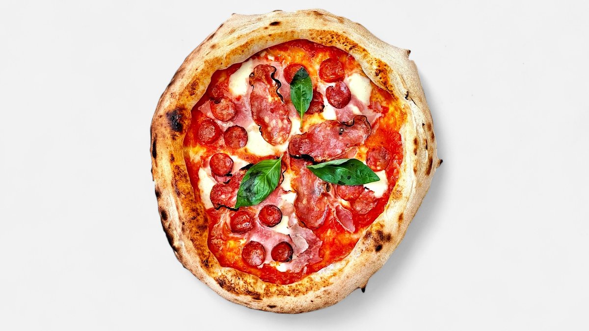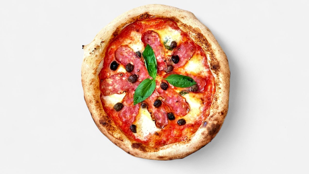 salám Spianata, tmavé olivy Leccino, Mozzarella Fior di Latté, rajčata San Marzano, Grana Padano