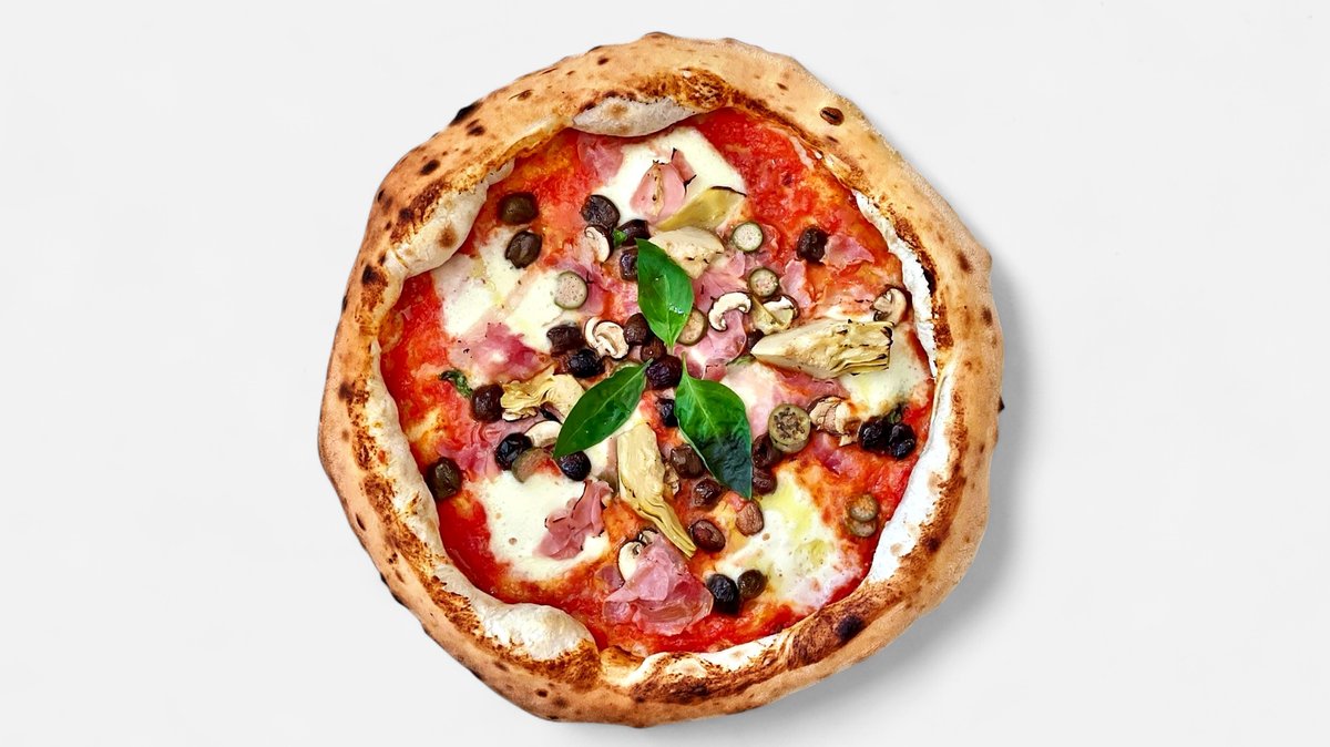 dušená šunka Prosciutto Cotto, čerstvé žampiony, tmavé olivy Leccino, artyčoky, kapary, Mozzarella Fior di Latté, rajčata San Marzano, Grana Padano