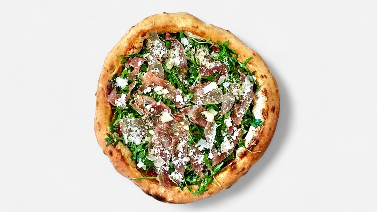 sušená šunka Prosciutto Crudo, rukola, Parmigiano Reggiano, Mozzarella Fior di Latté, rajčata San Marzano, Grana Padano