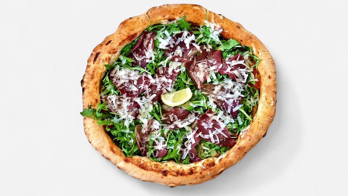 sušená hovězí šunka Bresaola, rukola, Pecorino Romano, Mozzarella Fior di Latté, rajčata San Marzano, Grana Padano