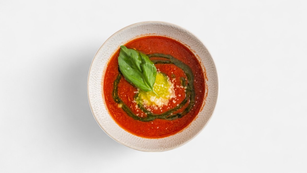 krémová polévka z rajčat San Marzano, bazalkové pesto, Parmigiano Reggiano