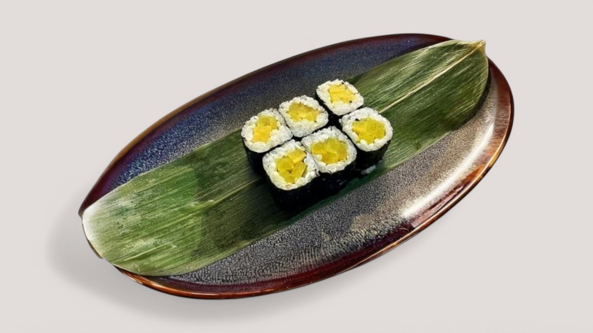 INSIDE: avocado, cucumber, fried sweet potato, radish OUTSIDE/ COVERED : avocado, mango sauce, beetroot, sesame 8 pieces
