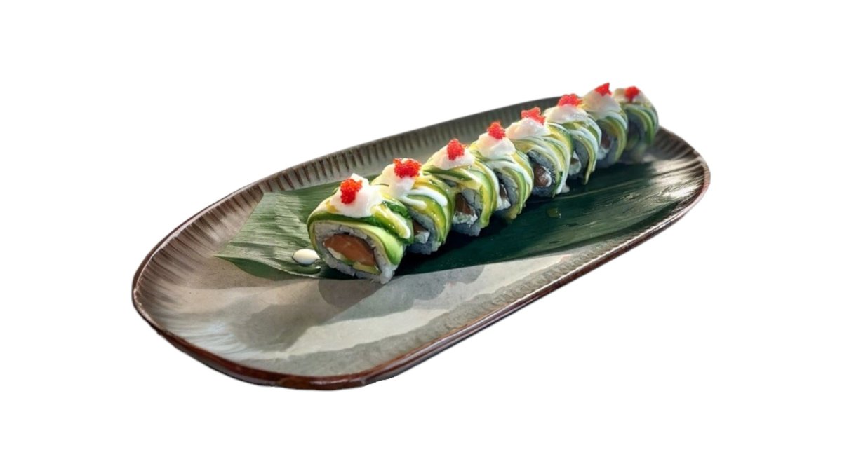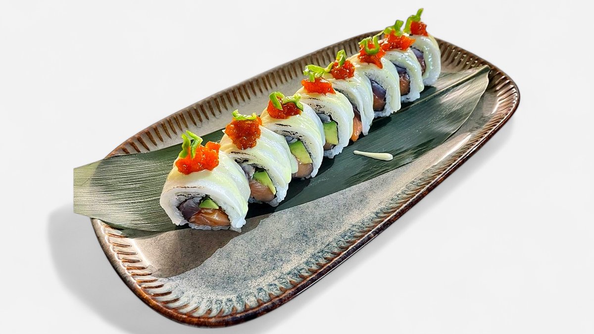 - INSIDE: salmon, avocado, philadelphia cheese - OUTSIDE/ COVERED: avocado, creamy butterfish with caviar, Passion Fruit-Coconut milk sauce 8 pieces